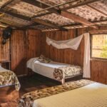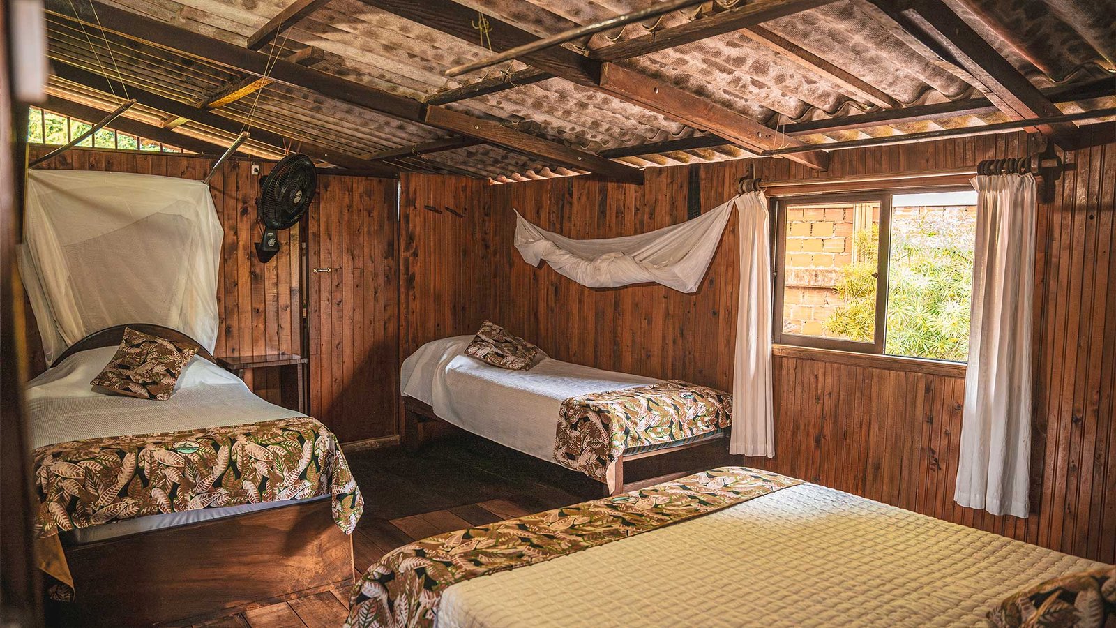 Camas múltiples. Inicio con 4 habitaciones en una casa de madera rústica dotadas con ventilador, hoy día en la parte de atrás tiene 6